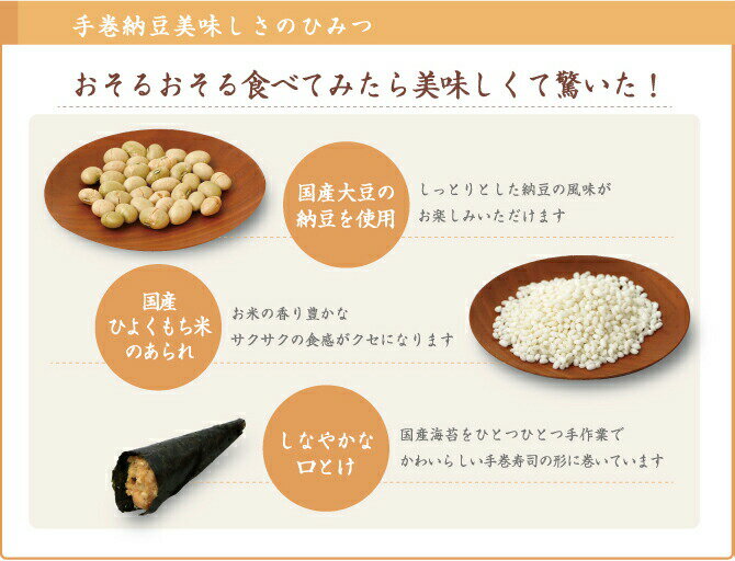| 商品紹介 | 大豆で作った納豆と、サクサクのあられを練り合わせ、かわいらしい手巻き寿司の形に仕上げました。 ピリッときいた辛子がアクセントの、本格的なおかず納豆の風味です。 ユニークなお手土産としても、人気の一品です。 |