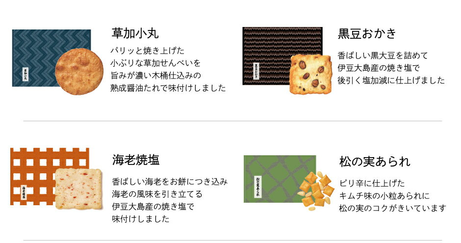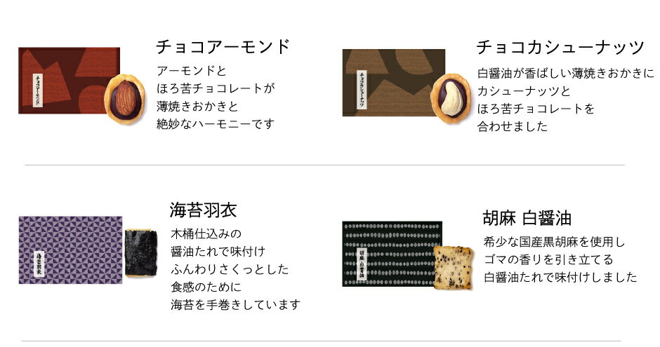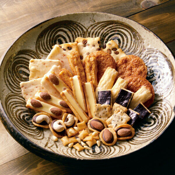 | 内容量 | 12種22個入 チーズおかき3、チーズアーモンド3、チョコアーモンド1、 チョコカシューナッツ1、揚げ塩3、揚げ醤油3、松の実あられ1、 黒豆おかき1、草加小丸1、海苔羽衣1、海老焼塩2、胡麻白醤油2 |