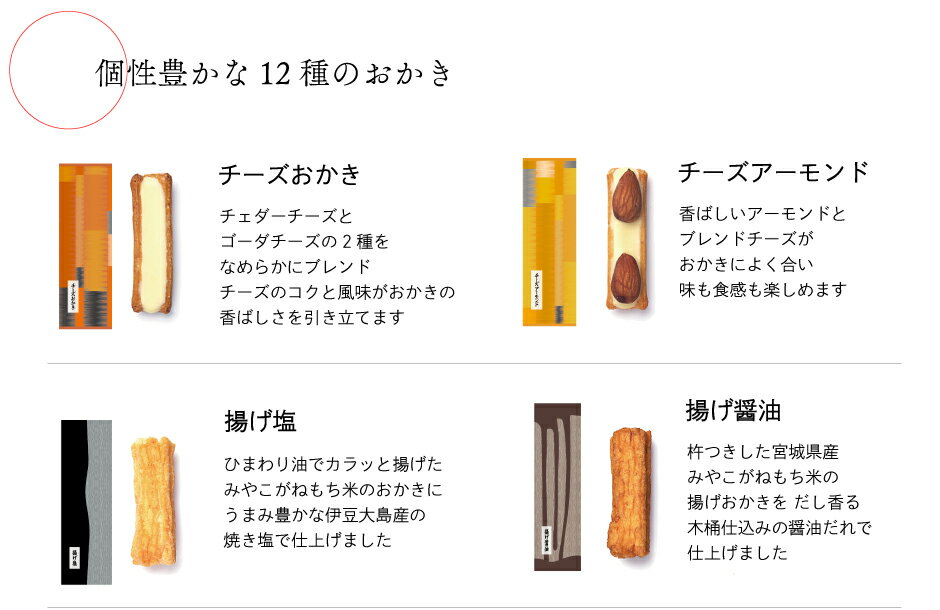 | 商品紹介 | 素材から装いの細部まで、全てに心を配った銀座あけぼのの自信作です。 チーズ・チョコなど個性的なおかきも入った、こだわり12種のおかきを22個詰合せました。 |